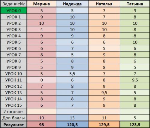Итак, по итогам уроков лидирует Наталья Помазанова, в сумме набравшая 129,5 баллов. И теперь начинается самое интересное - участницам предстоит большое финальное задание, цена которого (максимально) 100 баллов. Следите за новостями! Финиш уже на следующей неделе!